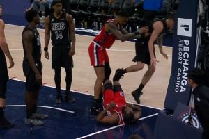 哈登上篮,杰明犯规,有一个保护的动作,但科林斯误会了,直接上来就推飞了杰明,曼恩也回推一把。
