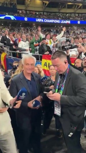 体育资讯01月29日讯 本菲卡4-2皇马赛后,穆里尼奥接受场边采访时,一旁的皇马球迷高唱穆里尼奥之歌。