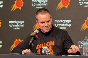 体育资讯1月30日讯 太阳114-96轻取活塞。赛后,太阳主帅奥特穿着印有“狄龙大反派”字样的定制T恤接受媒体采访。太阳本场安排发放了5000件印有“狄龙大反派”的T恤,狄龙本场得到40分,刷新个人生涯新高。